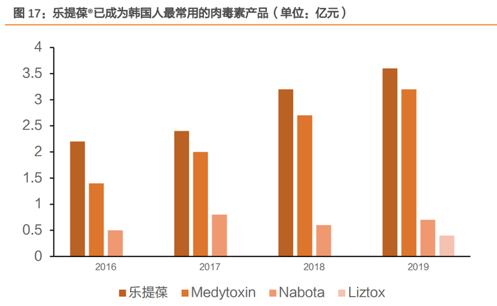 根据Hugel公司年报,2019年乐提葆全球销售收入达1.29亿美金,在韩国市场占有率达42%,连续四年市场销售额第一,已成为韩国人最常用的肉毒素产品。