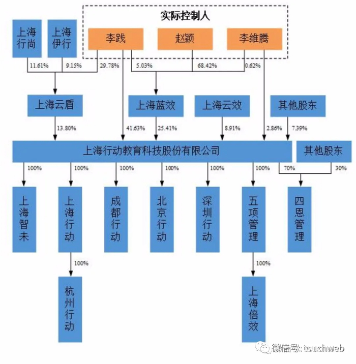 IPO前,李践直接持有公司41.63%股权,为公司控股股东;李践还通过持有上海云盾29.78%出资额度并担任其执行事务合伙人间接控制行动教育13.8%的股权。李践一共直接持有及间接控制的公司股权为55.43%。