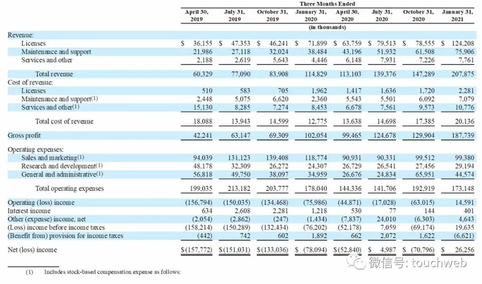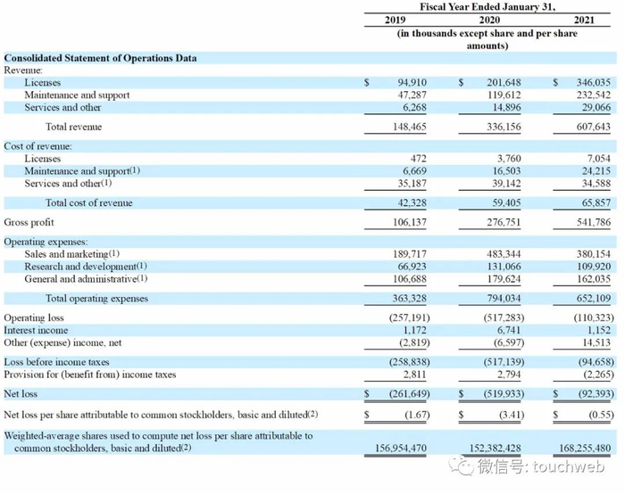 UiPath在截至1月31日的2019财年、2020财年、2021财年授权收入(Licenses)分别为9491万美元、2亿美元、3.46亿美元。Maintenance and support收入分别为4728.7万美元、1.2亿美元、2.32亿美元。