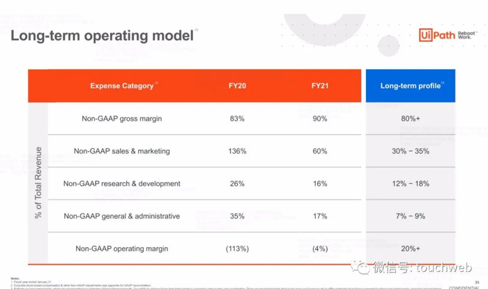 UiPath在截至1月31日的2019财年、2020财年、2021财年的销售与市场费用分别为1.9亿美元、4.83亿美元、3.8亿美元;研发开支分别为6692万美元、1.31亿美元、1.01亿美元。