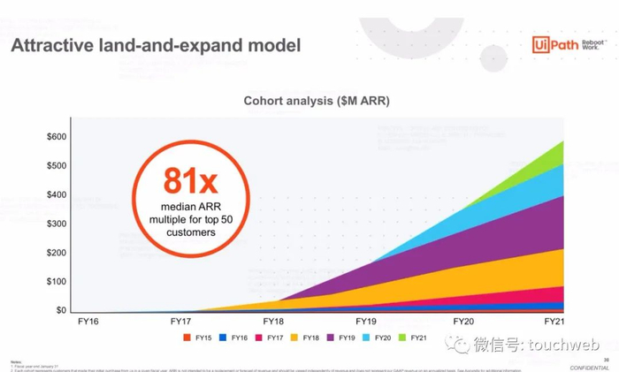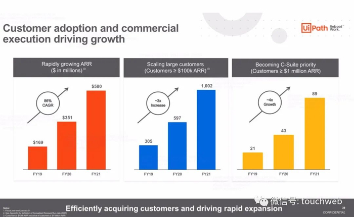 截至2021年1月31日,UiPath有1002个客户ARR为10万美元或以上,及89个客户ARR为100万美元或以上,分别占截至该财年收入75%和35%。