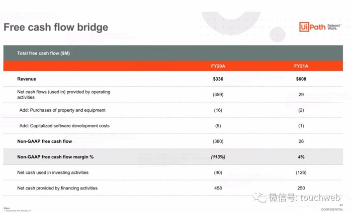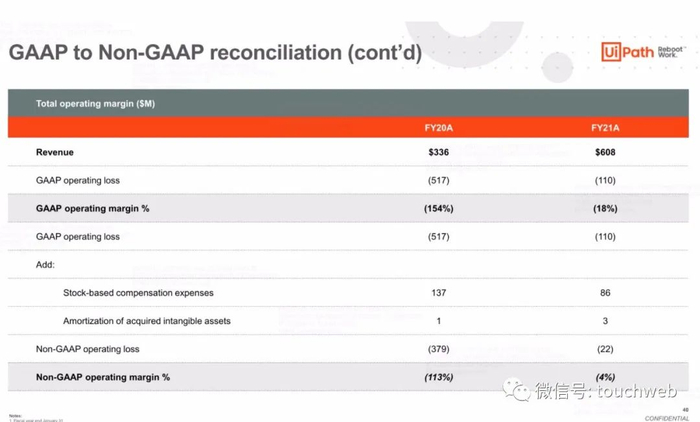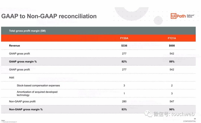 招股书显示,UiPath在截至1月31日的2019财年、2020财年、2021财年营收分别为1.48亿美元、3.36亿美元、6.08亿美元;