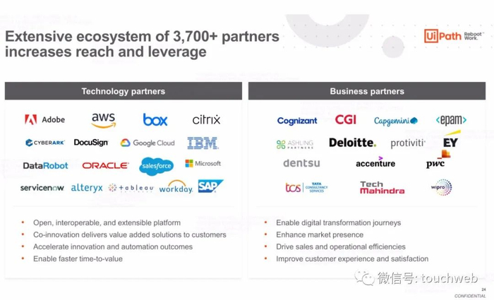 UiPath构建了“技术合作联盟”,包括微软、泰比(ABBYY)、Orcale等。UiPath还携手各大信息咨询公司,如埃森哲、德勤、毕马威等咨询机构,共同开拓全球RPA市场。