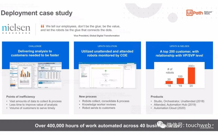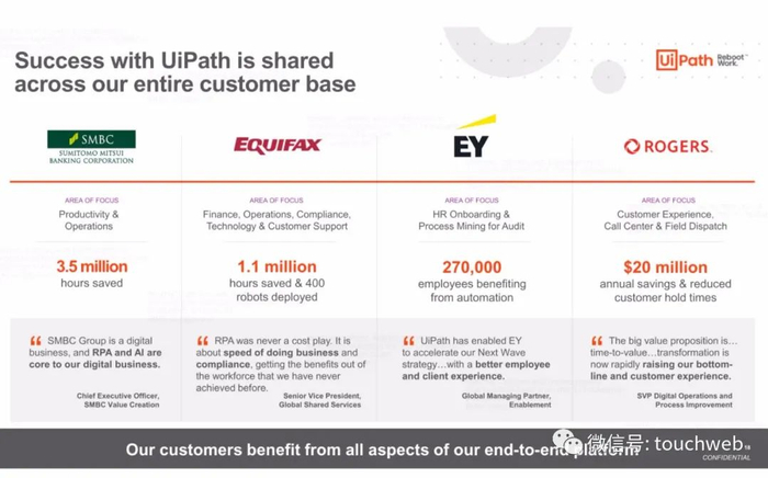 迄今UiPath为超过65%财富500强公司和8家财富10强公司提供自动化解决方案,包括谷歌、惠普、空中客车、通用、NASA、Autodesk和DHL。