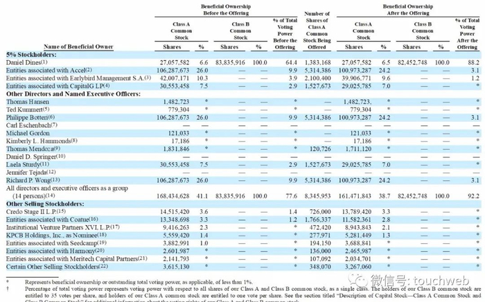Institutional Venture Partners XVI, L.P.持有2.3%的A类股;KPCB持有1.4%的A类股,Seedcamp持有1%的A类股。