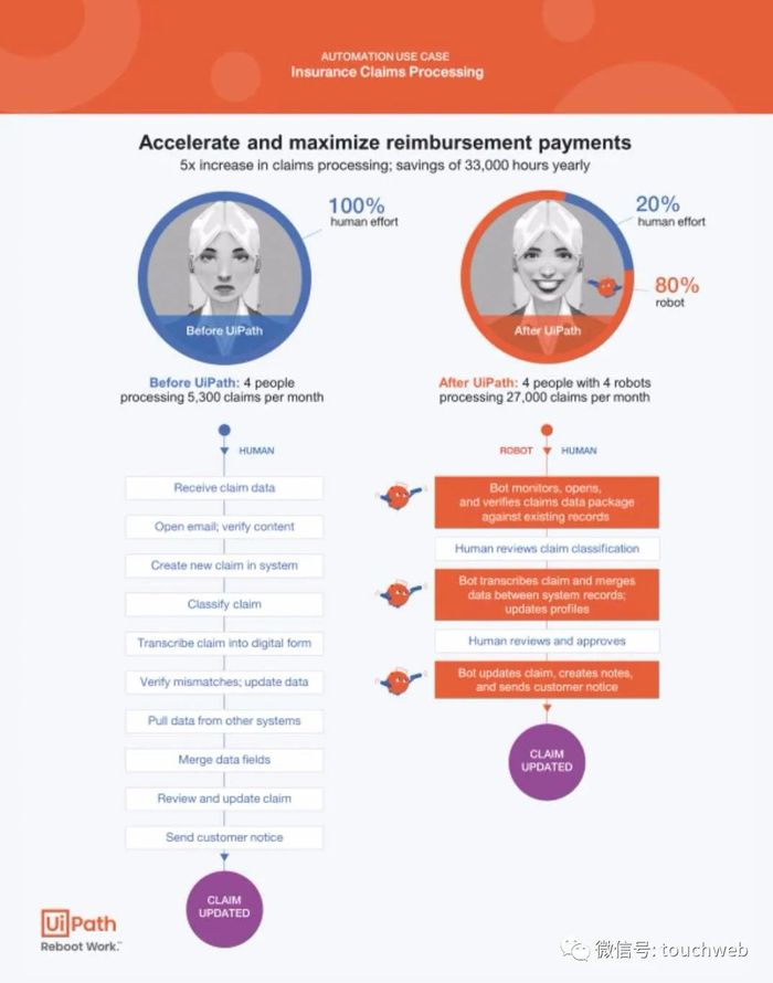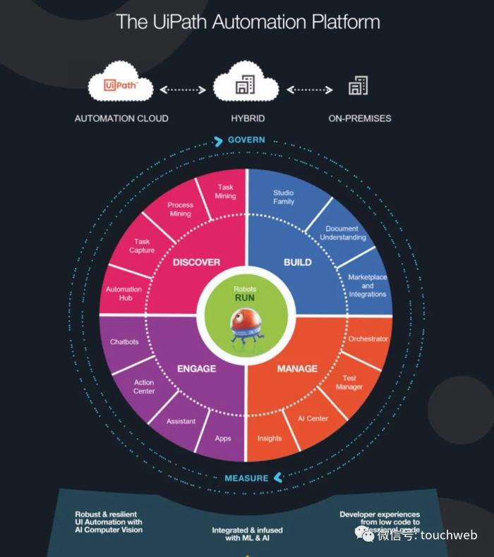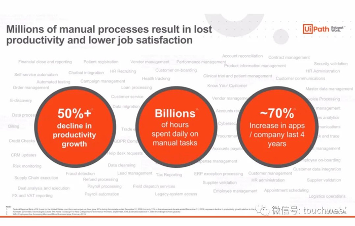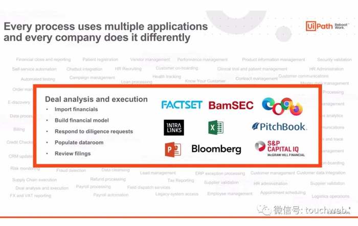 同时,UiPath的RPA解决方案采用多管齐下的方法,从任务发现开始:通过从现有企业系统中提取日志数据来产生端到端桌面、Web,形成了辐射到文本、业务应用程序、电子邮件、IT办公工流的“ X射线”,从而帮助企业解决流程下达、可视化、标签和KPI等问题。