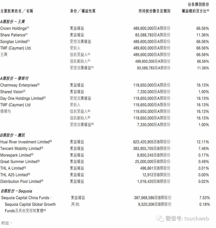 王兴有573,188,783股A类股,有45.82%的投票权;王兴主要通王兴家族基金Crown Holdings及王兴控股的Shared Patience持有。