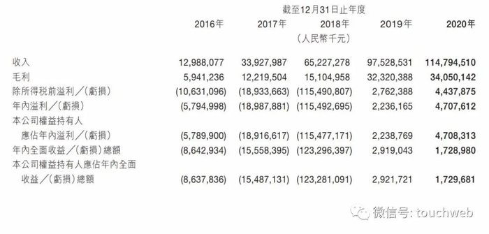 美团2017年、2018年、2019年、2020年期内盈利分别为-189.88亿元、-1154.93亿元、22.36亿元、47亿元;归属于股权持有人年内利润分别为-154.87亿元、-1232.8亿元、29.2亿元、17.3亿元。