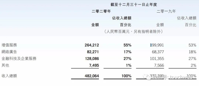 其中,腾讯2020年增值服务营收为2642亿,占比55%,网络广告收入822.71亿元,占比为17%;金融科技及企業服務收入为1280.86亿元,占比为27%。