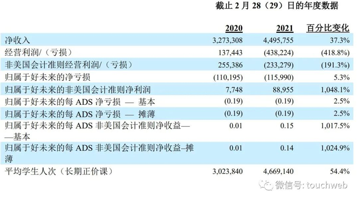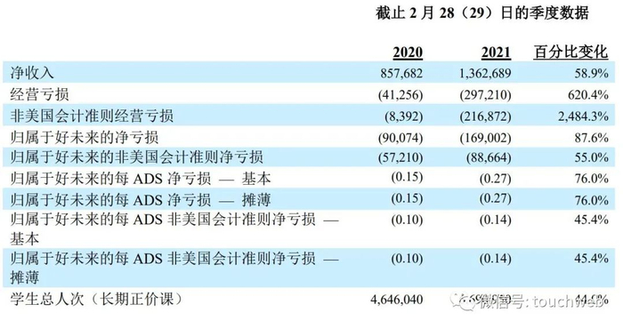 好未来2021财年第四季季度经营亏损2.972亿美元,上年同期经营亏损为4130万美元;非美国会计准则经营亏损(不考虑股权激励费用)为2.169亿美元,上年同期非美国会计准则经营亏损为840万美元。