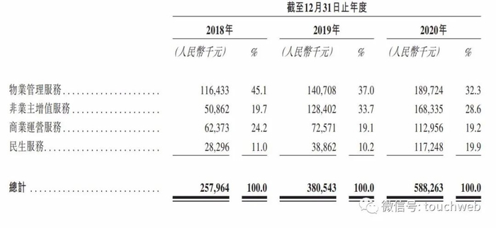 其中,新希望服务2020年来自物业管理服务的收入为1.9亿元,占比为32.3%;来自非业主增值服务收入为1.68亿元,占比为28.6%;