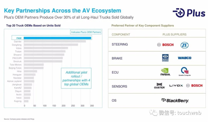 智加科技(Plus)称,新资本的注入将进一步助力智加科技的全球商业化拓展,推动量产自动驾驶重卡的落地应用。目前,智加科技已与多家重卡主机厂和物流车队建立了深度战略合作关系。