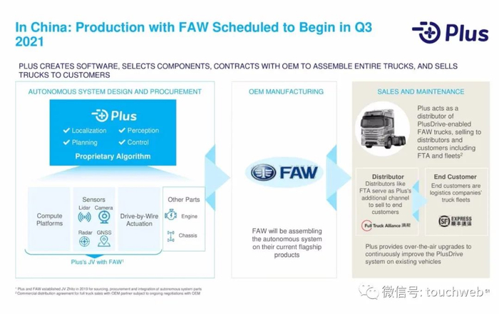 在中国,智加科技助力商用车企业一汽解放推出高级别自动驾驶重卡J7 L3,将于2021年年中实现量产上市;同时,智加携手顺丰,实现商业化运营。在美国,智加也将于2021年同步推出量产自动驾驶产品,服务头部物流客户。