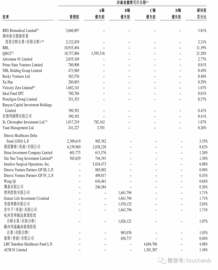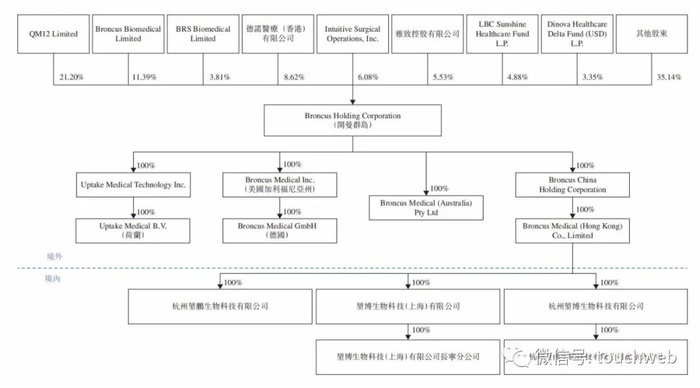 IPO前,QM12 Limited持股为21.2%,Broncus Biomedical持股为11.39%,BRS Biomedical持股为3.81%,德诺医疗持股为8.62%;
