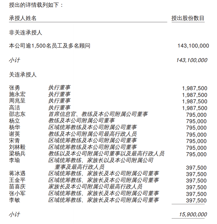 据公告,海底捞董事会已于5月20日决议通过股份奖励计划授出股份,决定将向承授人授出共计1.59亿股股份,其中1.431亿股股份授予本公司逾1500名员工及多名顾问(非公司关联人士);1590万股股份授予公司及附属公司的17名董事及最高行政人员。