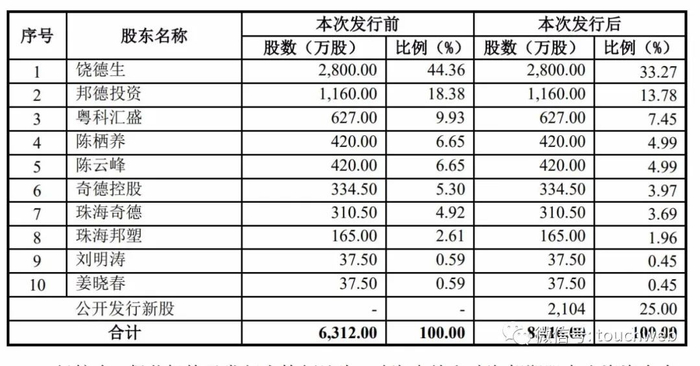 IPO后,饶德生持股为33.27%,邦德投资持股为13.78%,粤科汇盛持股为7.45%,陈栖养、陈云峰分别持股为4.99%;