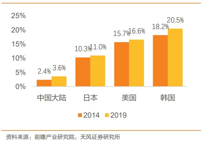 据艾瑞咨询的数据,2019年中国医美用户达到1120万人,近5年来复合增长率达到52.6%,渗透率虽自2014年的2.4%提高至2019年的3.6%,但若对标全球医美大国,如美国、日本、韩国的16.6%、11%和 20.5%,差距仍然较大,有较大提升空间。