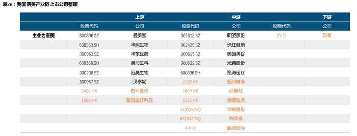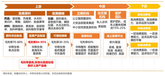 从产业链看,医美行业主要分为三环:上游原料生产端、中游药械设备生产和下游服务机构及平台端。