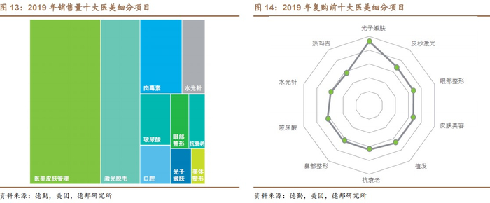 轻医美项目以活性材料注射和光电项目为主,维持效果相对偏短,但也因此具有高粘性、高复购等消耗属性。据德勤&美团《中国医美市场趋势洞察报告》,2019年销量前十和复购前十的项目中皆主要以注射无创类的轻医美为主。