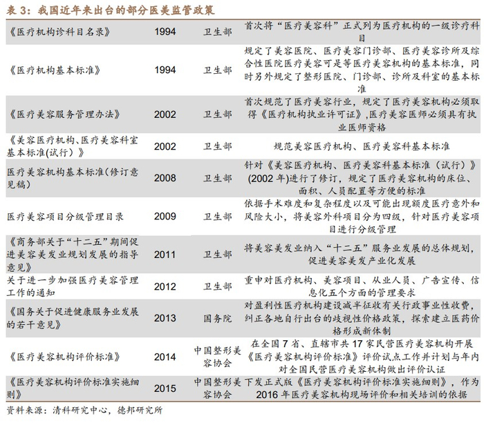 从2002年起国家陆续发布医疗美容服务管理办法、机构标准和分级管理目录,出台了医美机构评价标准及细则,并对医美器械药品进行更加严格的管控。2016年,中国整形美容协会成立,标志着医美服务机构正式进入合规化时代。