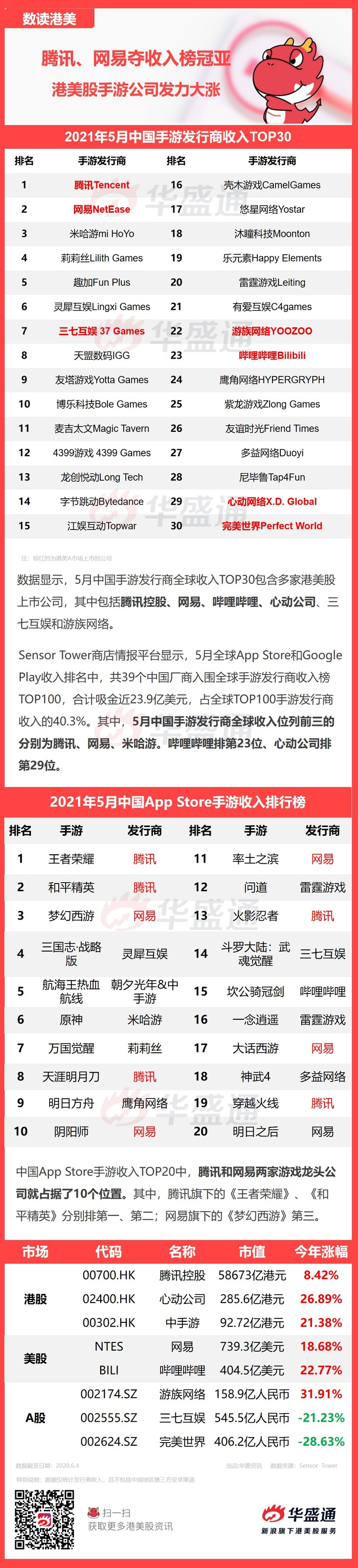数据显示,5月中国手游发行商全球收入和App Store手游收入的排行榜中包含多家港美股上市公司,其中有腾讯控股、网易、哔哩哔哩、心动公司、中手游等。