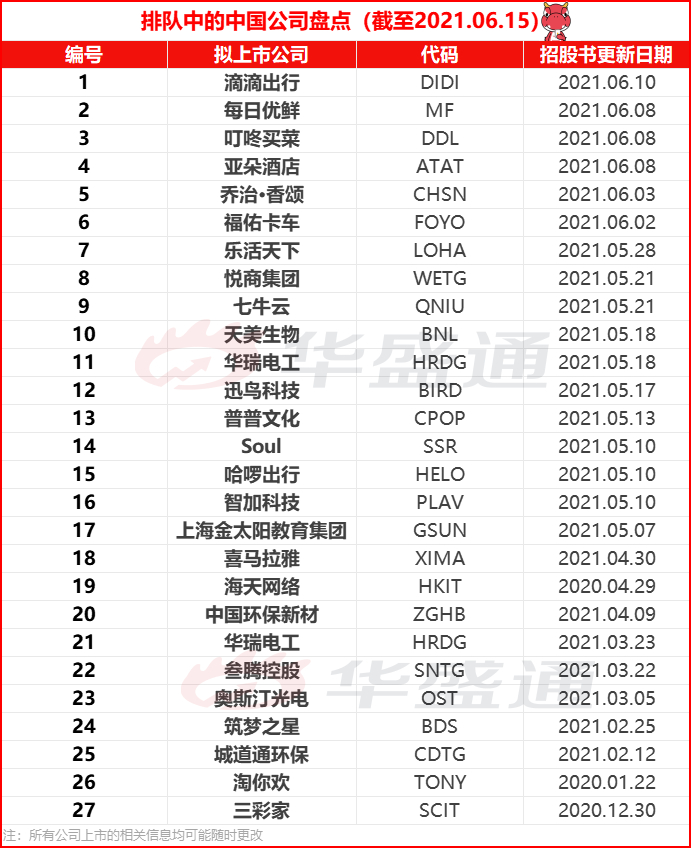 除了以上预计本周上市的14只新股外,上周有滴滴出行、亚朵酒店、每日优鲜和叮咚买菜等递表SEC的中国公司,值得投资者关注。