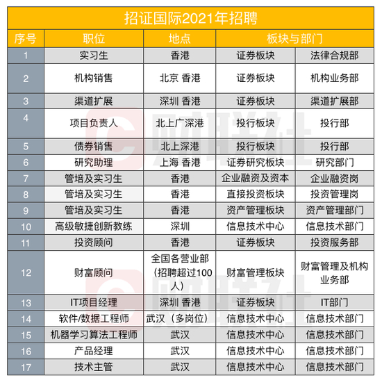增聘金融行业高级管理人员及国际人才,进一步增强其在企业融资及资本市场、经纪、销售及交易和资产管理方面的实力,并推出崭新的环球商品业务,是招商证券“转型至全功能型投资银行”的目标。人才招聘成为了转型路上的重中之重,所以才会有2021年如此大规模、涉及北上广深武汉和香港的大型招聘。