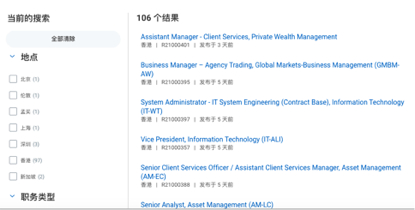 全部106个招聘职位当中的97个,都在大本营香港。其中,资产管理相关职位有18个,私人财富管理占13个,企业融资招聘的岗位为12个。全部97个职位招聘中,分析师职位有17个,经理职位6个,副总裁职位2个。