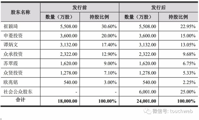 IPO后,崔颖琦持股为22.95%,申菱投资持股为15%,谭炳文持股为13.05%,众承投资持股为9.68%,苏翠霞持股为6.75%,众贤投资持股为5.33%,欧兆铭持股为2.25%,