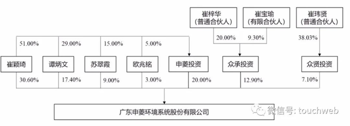IPO前,崔颖琦直接持有公司30.60%的股份;崔颖琦持有申菱投资51%的股权,申菱投资持有公司20%的股份;崔梓华系众承投资的执行事务合伙人,崔宝瑜系众承投资的有限合伙人,众承投资持有公司12.9%的股份;