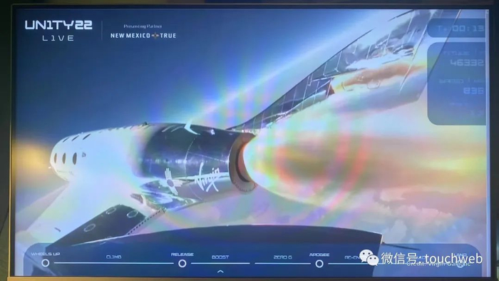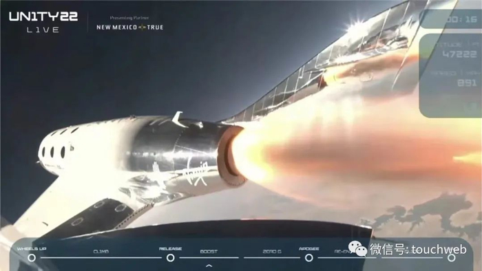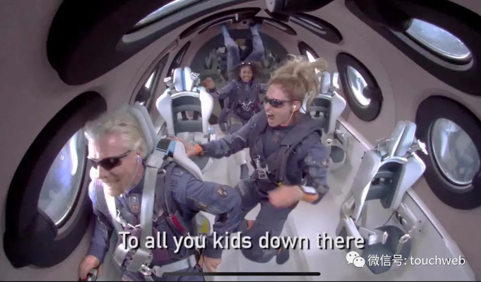约15分钟之后,Unity 22成功与母飞机分离,点燃引擎,极速攀升。几分钟之后,画面传来机舱内的情况,四名“宇航员”离开座位,体验失重感。不过,这个体验失重感的过程很短。