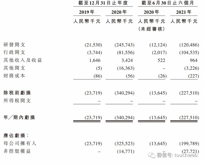 百心安生物目前暂无营收,还处于亏损状态。招股书显示,百心安生物2019年、2020年分别年内亏损为2372万元、3.4亿元。百心安生物2021年上半年亏损为2.27亿元,上年同期的期内亏损为1365万元。