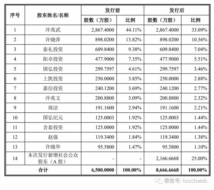 IPO后,冷兆武、许晓萍夫妇直接、间接控制公司股份比例共计48.96%。