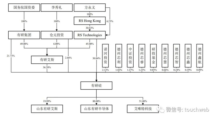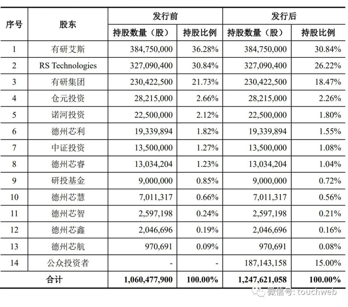 IPO后,有研艾斯持股为30.84%,RS Technologies持股为26.22%,有研集团持股为18.47%;
