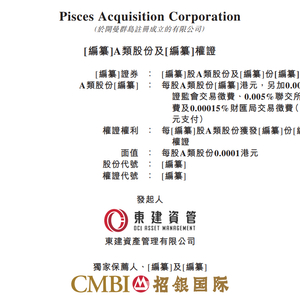 近日,Pisces Acquisition Corporation向港交所递交上市申请,为港股上市公司东建国际(00329.HK)的全资子公司,东建资管作为发起人,招银国际担任独家保荐人。