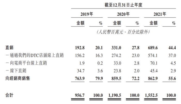 在C端市场,巨子生物线上线下结合,线下覆盖屈臣氏、盒马鲜生等化妆连锁品牌和连锁超市;线上电商平台和社交媒体平台的DTC店铺向消费者进行销售。值得一提的是,巨子生物的线上业务不需要经过经销商,采取直销模式,具有更高的利润,且销售额逐年增长。2019年至2021年,线上业务的销售额在收入中占比由16.5%提升至41.5%。