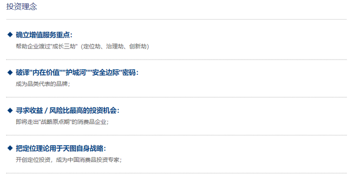 据官网信息,天图投资创始于2002年,是国内最早从事股权投资的专业机构之一。天图投资率先专注于消费品领域的投资,走聚焦和专业化之路,所投项目涵盖了创新消费、新型零售、消费科技三大消费升级方向。