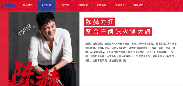 陈赫为昔日贤合庄的股东之一,无论是从经营层面还是品牌印象层面,或都已和贤合庄深度绑定,这也是很多加盟商愿意加盟贤合庄的重要原因之一。