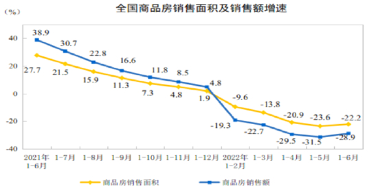 据国家统计局,今年1-6 月销售面积同比-22.2%,6 月单月销售面积同比-18.3%,单月增速较上月上升13.5百分点;6 月单月销售金额同比-20.8%,单月增速较上月上升16.9百分点。
