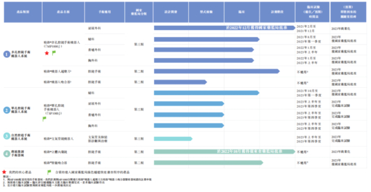 除MP1000及SP1000外,精锋医疗还有5项在研产品,其将产品范围由机器人辅助微创手术扩展至无创自然腔道手术机器人及传统微创手术器械。其中,精锋支气管镜机器人用于自然腔道腔镜手术(“NOTES”)的手术,精锋医疗于2022年1月完成了第一代原理样机机器人的设计并开始动物测试。此外,精锋医疗正在开发的两类传统微创手术器械包括精锋®立体内窥镜(2022年10月获得广东省药监局批准)及精锋®智能吻合器。