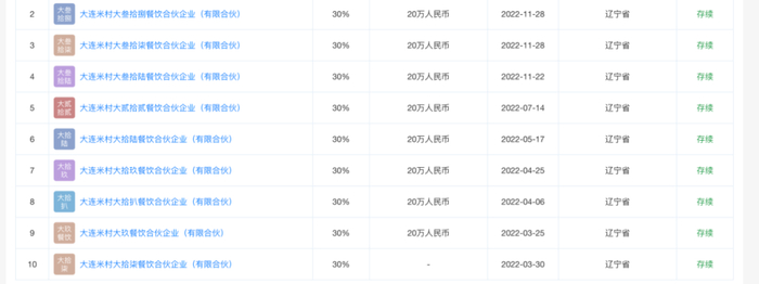 值得注意的是,据天眼查APP,米村拌饭相关运营主体基本上都以70%-30%股权结构的有限合伙公司为主,小股东担任执行事务合伙人,但这些主体在股东层面并没有和品牌公司“延边米村餐饮管理有限公司”(下称“米村管理”)有任何关联。