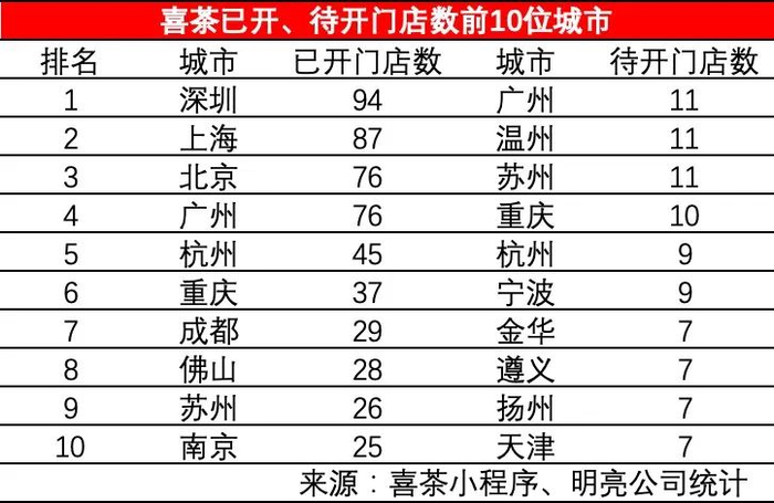 喜茶已开门店数的前10的城市:深圳94家,上海87家,北京/广州76家,杭州45,重庆37,成都29家,佛山28家,苏州26家,南京25家。