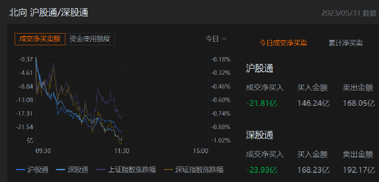 午评:北向资金净卖出45.74亿元 沪股通净卖出21.81亿元 新浪港股 新浪港股官方账号 2023.05.3111:30 关注 5月31日消息,截至沪深股市午间收盘,北向资金净卖出45.74亿元,沪股通净卖出21.81亿元,深股通净卖出23.93亿元。