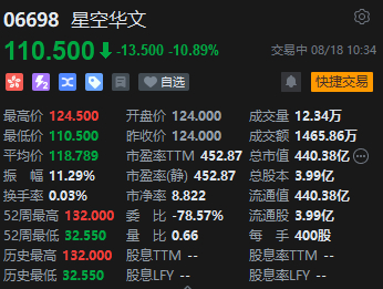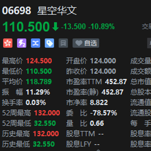 8月18日消息,《中国好声音》母公司星空华文盘中大跌超10%,截至发稿,跌10.89%,报110.5港元,成交额1465.86万港元,总市值约440亿港元。