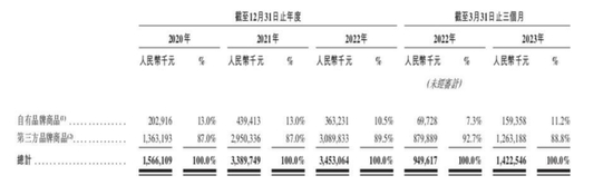 截至2023年一季度,KK集团营收占比中有近90%的收入来源于第三方品牌商品,自有品牌商品的收入占比从2020年的13%降至11.2%。