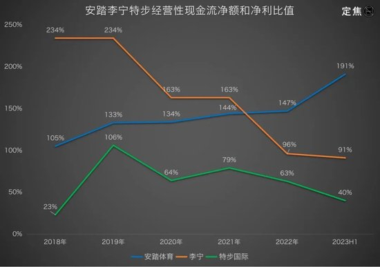今年上半年,安踏该指标进一步上升到191%,在头部品牌中处于高位,说明在去库存周期中,安踏的经营现金流在改善,销售商品花出去的现金流少,收到的现金流多,公司在产业链中有比较强的话语权;相比之下,李宁为91%、特步为40%。