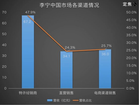 李宁和安踏都在经销转直营,不过,一位经销商告诉‘定焦’,李宁转直营的态度没那么彻底,需要的时间更长。目前,李宁依然有约半数收入来自经销渠道。