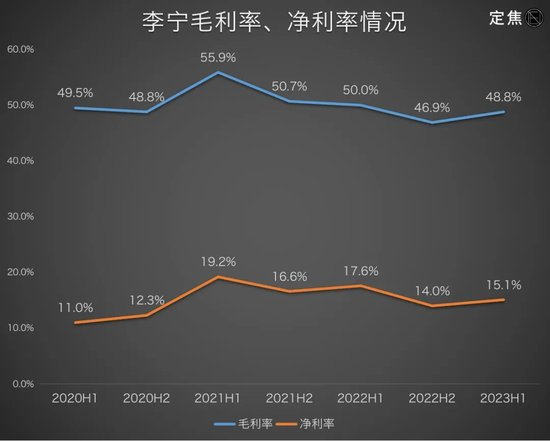 李宁的毛利率曾在2021年上半年大幅上涨到55%,今年上半年又回落到48.8%。成本和折扣都会影响毛利率。不过,李宁作为国内市场前五、国货第二,规模体量足够大,成本对它的影响不至于这么大。毛利率下滑,主要是加大折扣所致。李宁财报中没有公布折扣率,不过提到,为促进消费,增加了线上渠道和零售终端的折扣力度。