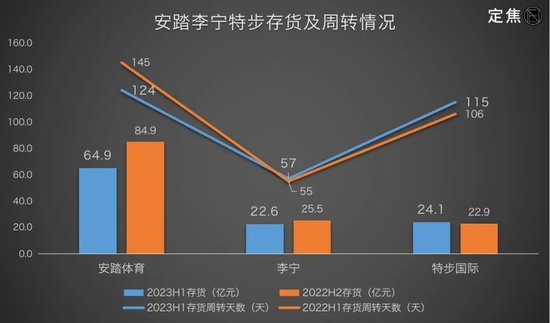 但在行业里,安踏的库存最庞大,平均存货周转天数一直处于高位:存货相当于李宁、特步国际的3倍;周转天数2.5倍于李宁。这与安踏主品牌的DTC转型有关,DTC模式更便于渠道管理,但也会背负更多存货。