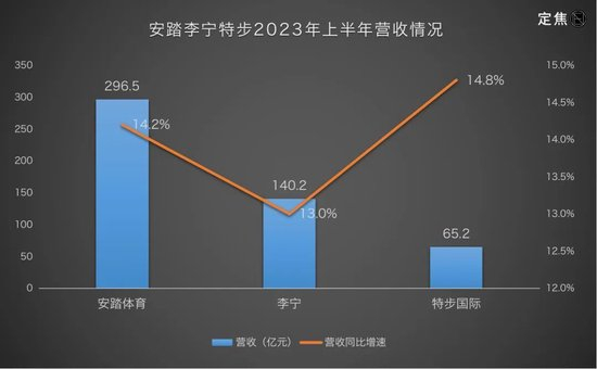整体来看,今年上半年,三大国货运动品牌都保住了营收规模,收入分别是296.5亿元、140.2亿元、65.2亿元,增速都在13%-15%。